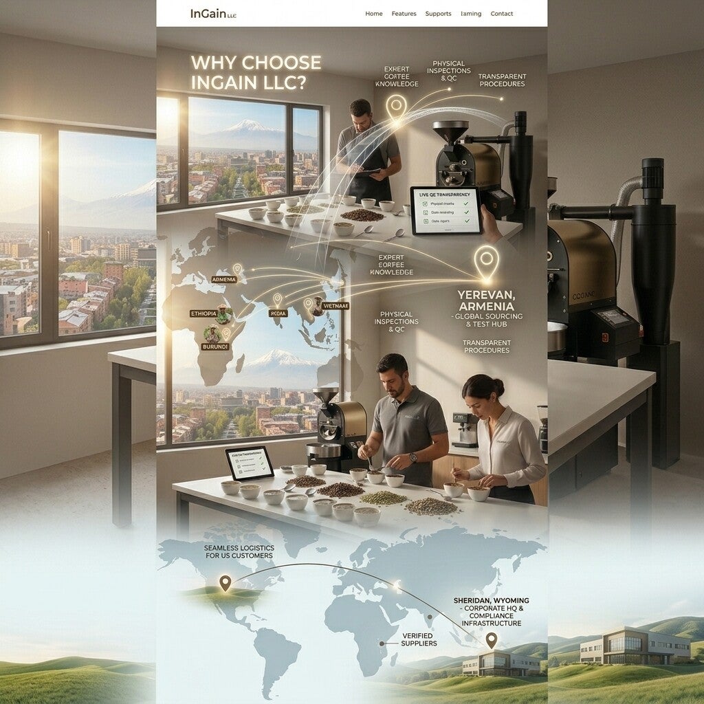 We are transparent, compliant, and deeply knowledgeable about coffee, import duties, customs clearance, and procedures. With established experience and a test and trade hub in Yerevan, Armenia, we conduct physical checks, inspections, and maintain live transparency with our customers who are historically and geographically closer to that region than the USA. InGain LLC operates a global sourcing and quality control office in Armenia (the bridge between our Asian and African origins) while maintaining our corporate headquarters and compliance infrastructure in Sheridan, Wyoming that meaning physically closer to our suppliers in Ethiopia, India, Vietnam and Burundi, which means better quality control and faster communication for our US customers.Our long-term business and friendly relations with verified suppliers ensure trust and reliability every step of the way.